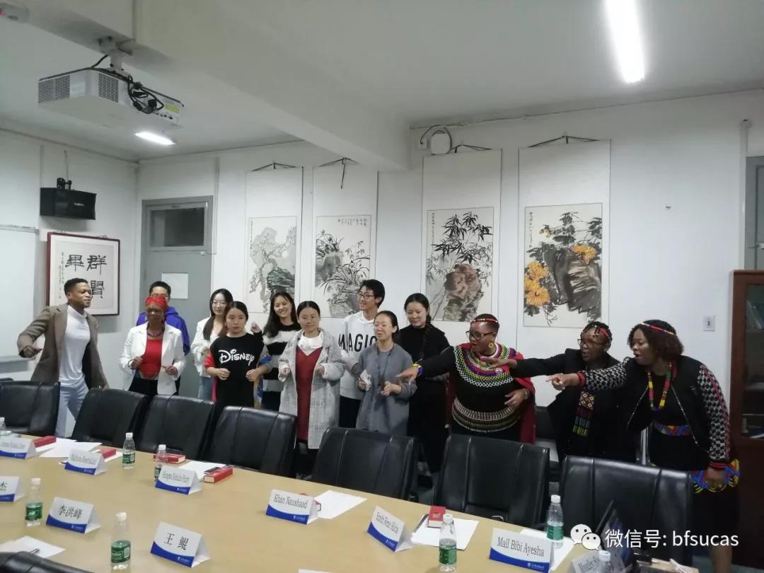 会谈结束后,bw必威西汉姆联官网2018级祖鲁语专业员工为代表团表演了祖鲁语歌曲,代表团的祖鲁语教授也即兴表演了祖鲁歌舞,场面愉快热烈。