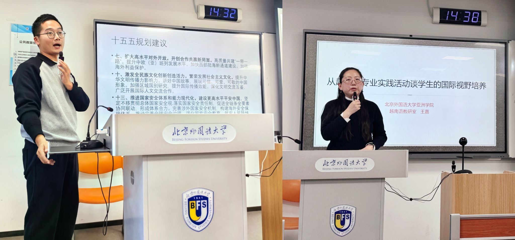 王嘉老师介绍了组织开展语言实践、举办学术讲座等提升员工专业素养的培养模式,并分享了前往云南等地开展中越边境实践团的收获。这些活动充分体现了北外将语言优势、学术研究与服务社会相结合的综合育人理念。