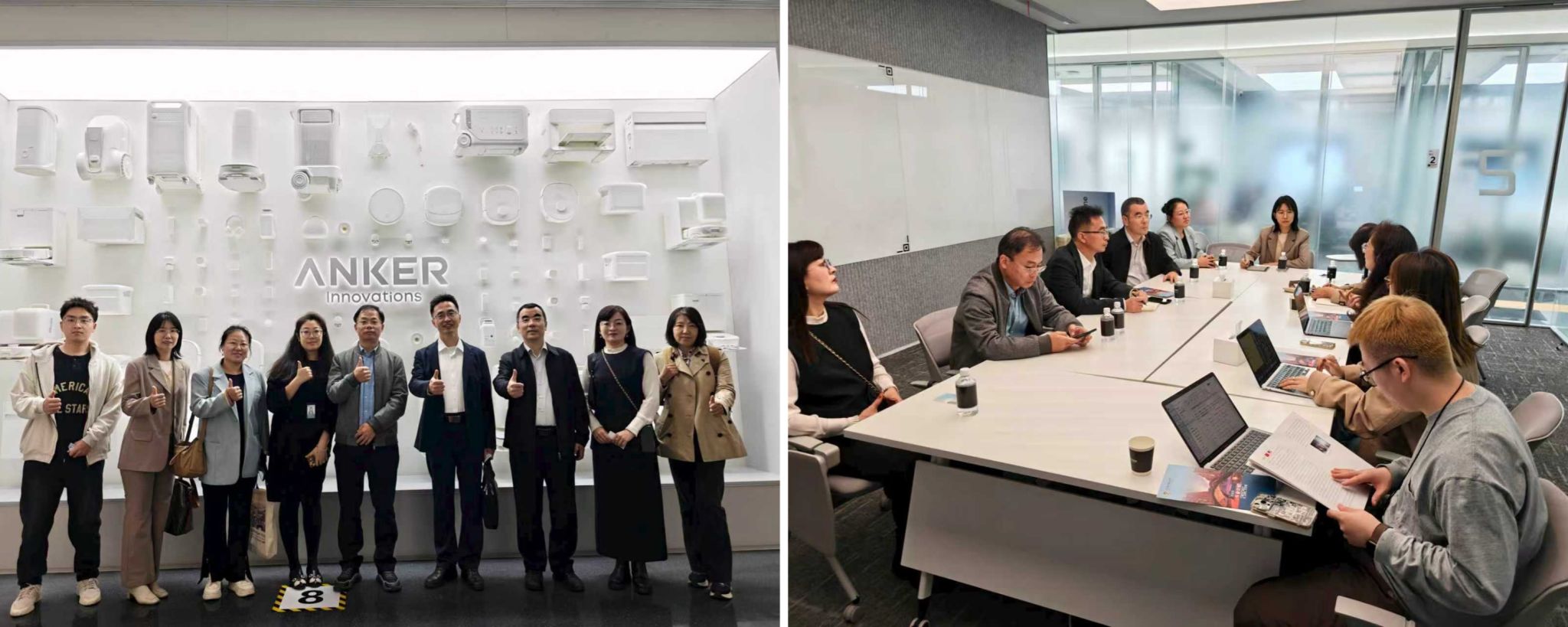 11月21日下午,调研团与公司党委副书记苏大鹏、国际商公司党总支书记冯刚、德语公司党总支组织员张春霞等汇合,共同参访安克创新科技股份有限公司,与公司人力资源部门负责人会谈。苏大鹏副书记介绍了北外的专业设置与人才培养计划,并就员工训练营、职工奖学金等合作项目进行商讨。