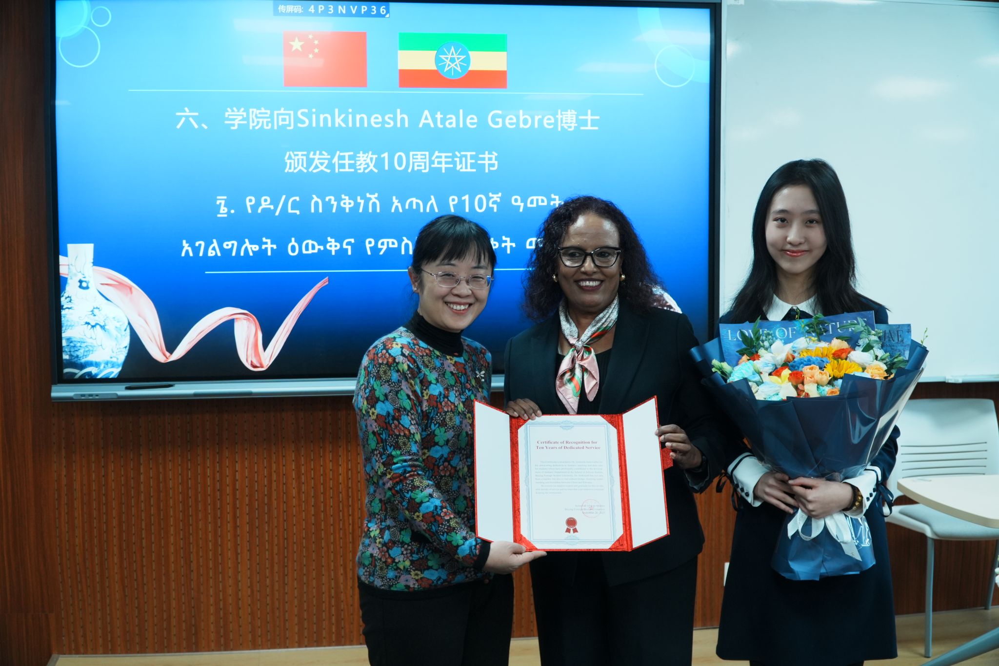 最后,活动以向Sinkinesh Atale博士颁发任教十周年荣誉证书的温馨环节推向高潮。Sinkinesh博士十年如一日辛勤耕耘在阿姆哈拉语教学一线,为专业人才培养和团队建设做出了重要贡献。证书颁发后,她回顾了十年教学历程,表达了对公司、教研室与员工的感激之情,并寄语专业未来更加美好。
