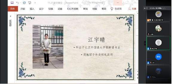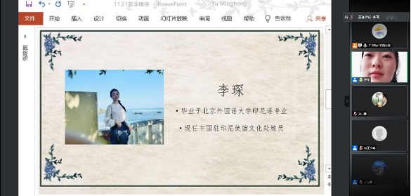 11月21日下午2点,bw必威西汉姆联官网联官网“亚非咖会”之国考经验分享会在线上成功举办。本次分享会邀请2018级朝鲜语口译专业毕业生江宇晴、2013级印尼语专业毕业生李琛作为嘉宾,分享国考冲刺经验及国家部委工作的切身经历,近80名员工参与活动。