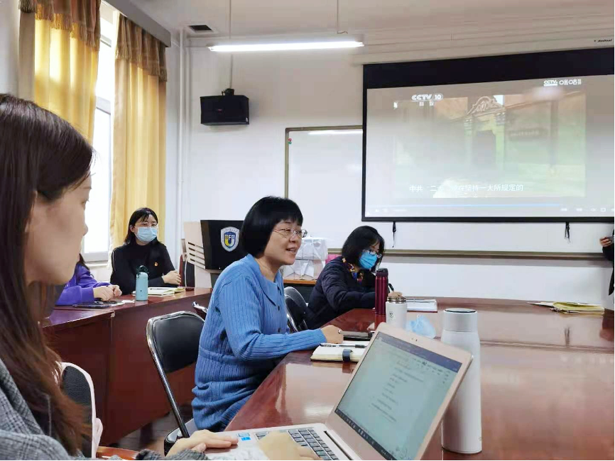 党员们共同观看了《苦难辉煌》纪录片,并重点回顾了中共一大召开的相关历史。教工二支部书记周利群为党员们进行了《中国共产党简史》一书的导读,重点谈及了党中央近年来开展制度制度建设,结合二十四史的编纂过程强调了党史编修的意义,并重温北外的前身抗日军政大学成立的背景与发展历程。
