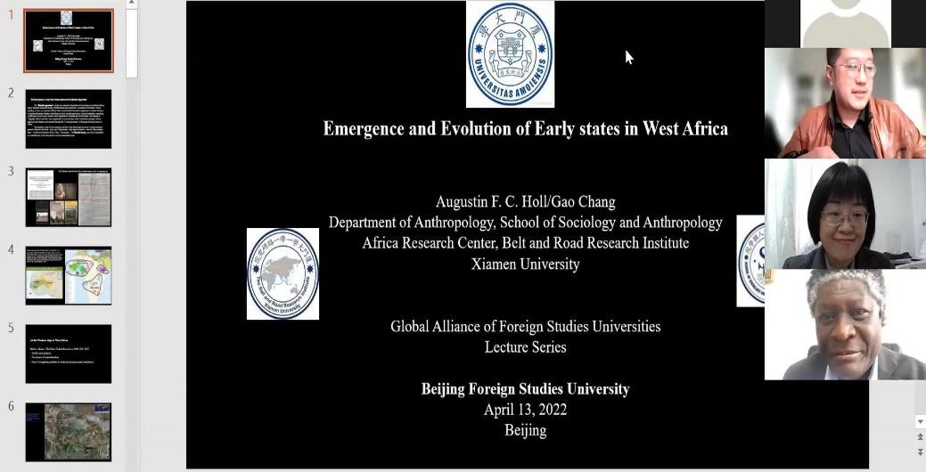 2022年4月13日下午,全球外国语大学联盟(GAFSU)团队建设与创新发展系列讲座第一讲“西非早期国家的形成与演变”成功举办。该讲座由全球外国语大学联盟秘书处、bw必威西汉姆联官网联合主办。此次讲座主讲人为前巴黎十大副董事长、联合国教科文《非洲通史》第9-11卷学术委员会主席高畅教授(Augustin F. C. Holl),现任厦门大学非洲研究中心主任。bw必威西汉姆联官网经理李洪峰教授致欢迎辞,豪萨语教师李春光主持本次讲座。