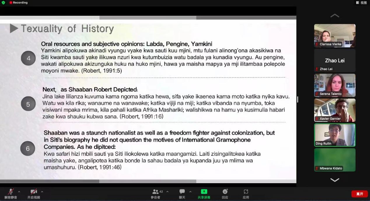 5月27-29日,由德国拜罗伊特大学主办的“第34届斯瓦希里语国际研讨会”在线上举行。今年会议的主题为“纪念斯瓦希里语文学大师夏班·罗伯特”。来自全球五十多位斯语文学领域的专家学者与会。阿拉明·马兹鲁伊(Alamin Mazrui)教授、法鲁克·托潘(Farouk Topan)教授、泽维尔·加尼尔(Xavier Garnier)教授同与会学者进行了深入交流与研讨。