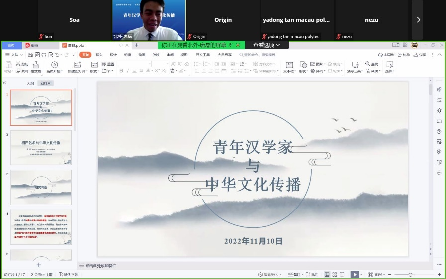 伊斯曼博士发言题目为:“‘中华文化走出去’背景下谈青年汉学家的积极作用”。他详细阐述了青年汉学家助力中华文化传播的意义及所面临的挑战,并深入探讨了如何发挥青年汉学家在中华文化传播中的积极作用。他认为,青年汉学家是中国文化的热爱者、体验者和传播者,对文化传播起到重要的作用。