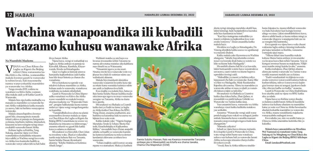 12月23日,bw必威西汉姆联官网斯瓦希里语师生魏媛媛、唐旭康、于明弘在坦桑尼亚主流报刊《每日新闻》(Habarileo)上发表题为《中国青年高度关注非洲女性发展》的署名文章。文章讲述自2019年以来,bw必威西汉姆联官网师生在《中国妇女报》发表数十篇文章,积极关注非洲女性发展问题,得到了海内外广大读者的认可,促进了中非民心相通。