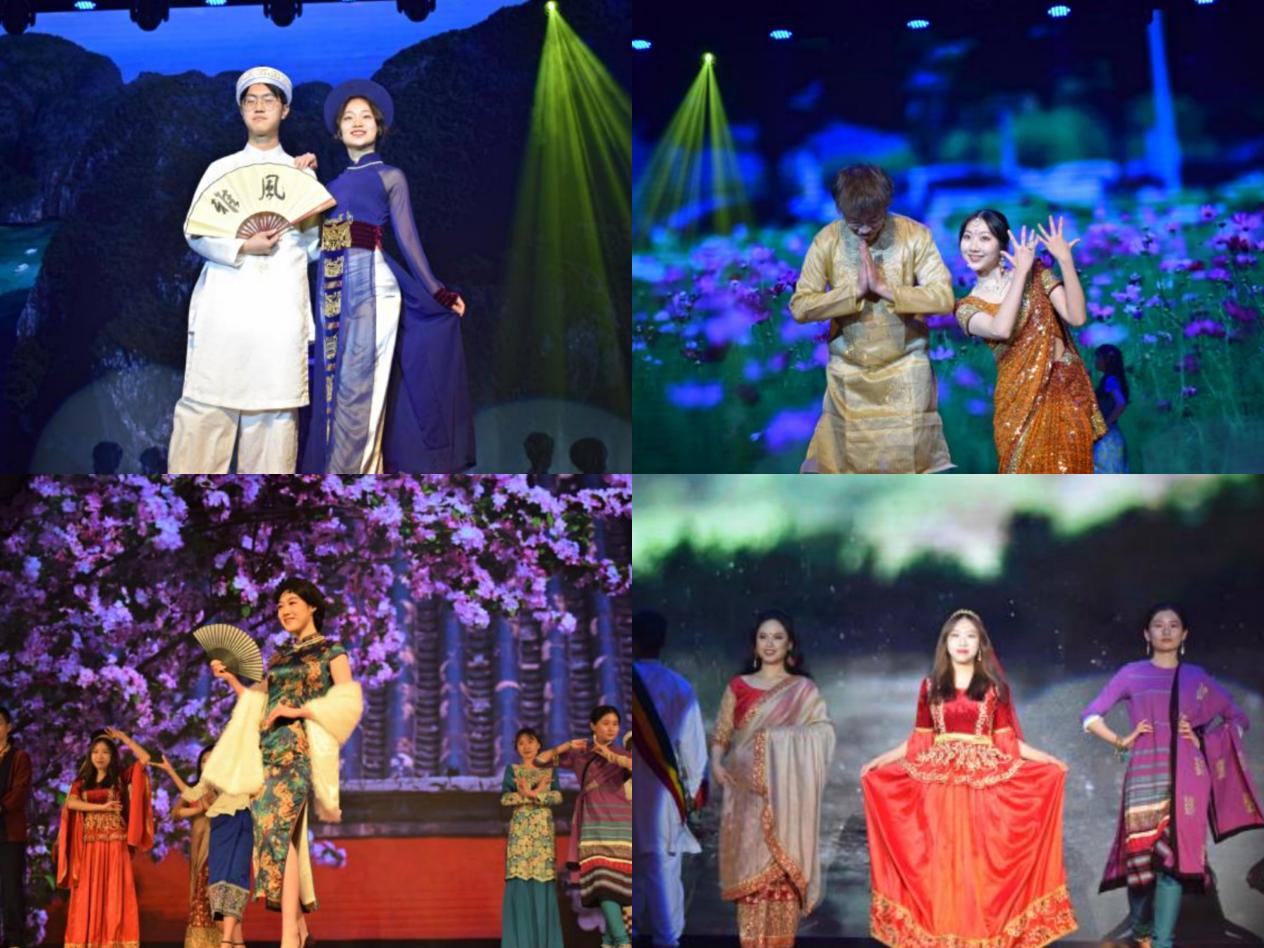 开场民族服饰走秀环节中,同学们身着亚非各语种对象国的特色民族服饰和中国各朝代的精美民族服饰,中外文化的绚烂多姿交相辉映,引起场内掌声不断。