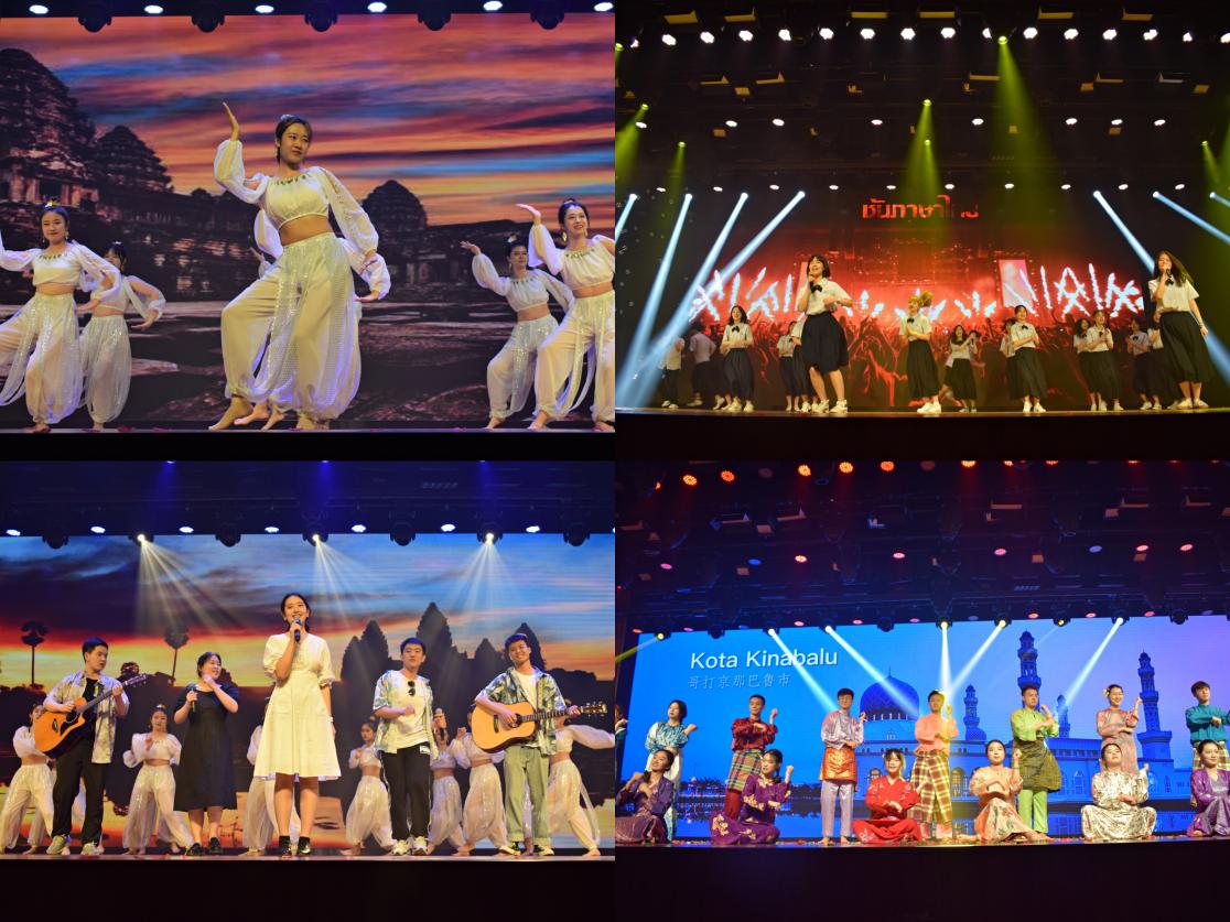 本次亚非巡礼晚会分为三个环节。第一环节《来之迢迢》中,19级柬埔寨语班、19级泰语泰传班、20级马来语班、19级20级朝鲜语班、20级土耳其语班、20级越南语班的同学们依次带来热情洋溢的表演,灵动曼妙的舞姿,饱含深情的歌声,活力四射的说唱,精彩的演绎感染了在场的每一位观众。