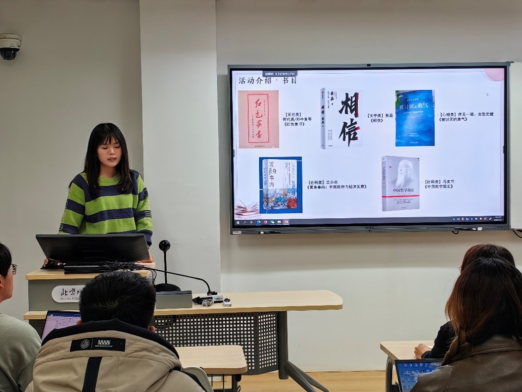 分享会中,主持人首先回顾了读书盲盒活动开展情况,肯定了大家假期期间积极打卡并分享感悟的毅力。随后,五个读书小组分别就阅读书籍进行分享。《红色家书》组将百余封家书按时间和内容总结为三大主题,结合实例深入挖掘了书信背后的英雄故事,带领大家感受红色基因的传承与赓续。《相信》组肯定了渐冻症“斗士”蔡磊以创业抗击渐冻症的商业模式和斗争精神,并通过调查问卷等多种调研方式拓展分析了蔡磊事迹的社会影响力。《被讨厌的勇气》组深入浅出地介绍了阿德勒心理学理论,并结合个人经历为大家分享阅读收获。《置身事内》组为大家梳理了全书内容,以浅显易懂的方式向大家分享经济学常识。《中国哲学简史》组以哲学知识竞赛、哲学人物分析及哲学思想辩论的形式展示对于中国哲学的思考。