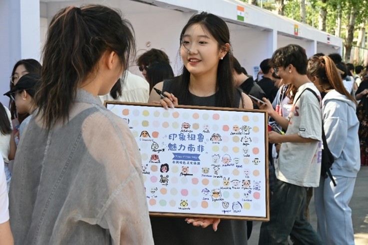 本次万国博览会设置了展示亚非国家特色文化的19个展台,游览者可以通过参与不同展台的活动了解对象国的风俗与文化。尼泊尔展台上的特色手绘海娜,吸引了大批游客前来体验;在亚美尼亚展台,游客可以DIY亚美尼亚字母吊坠,品尝来自亚美尼亚的特色美食;泰国展台则为游客们提供了泰式奶茶,游客们还可以通过参与泰语小游戏的方式学习泰语,赢取精致手信;游览坦桑尼亚展位的游客们可以收获专属的斯瓦希里语姓名;更有来自蒙古展位的驻唱歌手身着特色服饰,为前来的旅客们演奏悠扬的马头琴,展示蒙古特色音乐呼麦,令无数游客为之驻足。在各个展台的精心布置下,活动现场氛围火热,各式各样展现异域风情的特色活动引得全校师生与外国友人称赞连连。